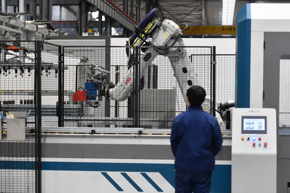 工人在位于杭州市臨平區的西奧電梯數字工廠內的自動化智能生產線工作(2021年12月17日攝)。新華社記者 黃宗治 攝