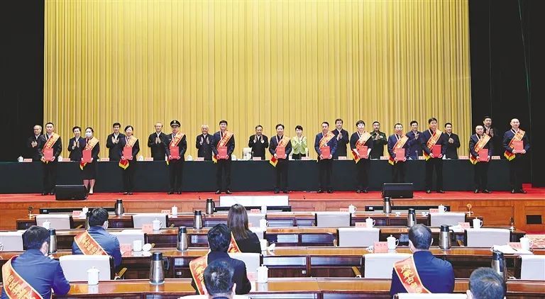 在自治區“擔當作為好干部”命名大會上,出席大會的自治區領導為“擔當作為好干部”代表頒發獎章和證書。