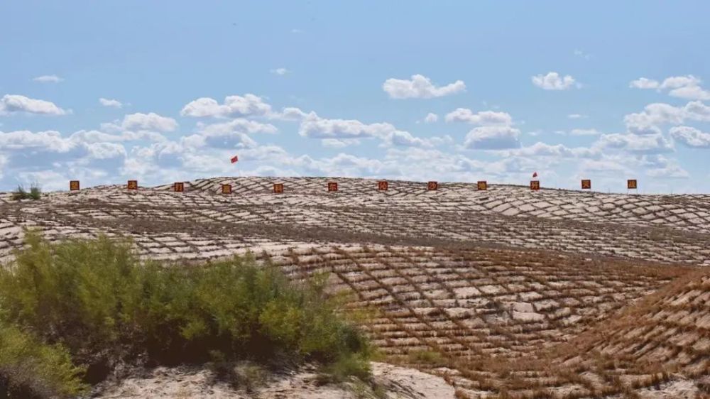 為防止烏蘭布和與巴音溫都爾兩大沙漠“握手”,巴彥淖爾市烏拉特后旗探索出“工程固沙+造封飛”系統治理模式,由沙柳、稻草、蘆草等10種材料做成的各式沙障鋪展在沙地上,構成一道獨特的風景。
