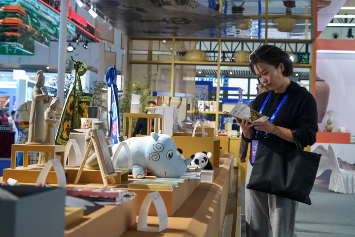 在版博會展覽現場,參會嘉賓在了解文創產品(新華社記者 唐文豪 攝)