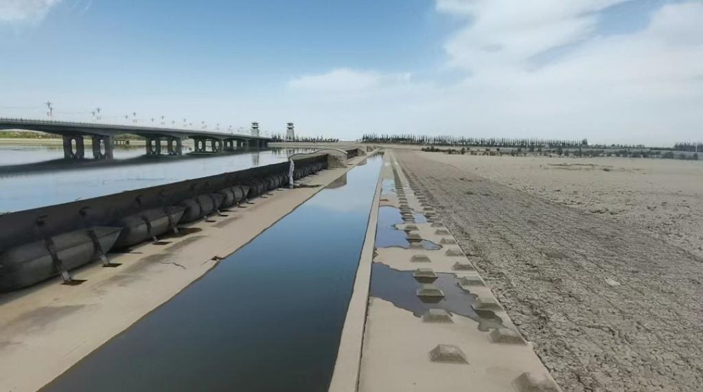 2023年8月24日,督察組前期暗查看到甘州區黑河新城大橋下游建設的橡膠壩在蓄水。(中央第四生態環境保護督察組供圖)