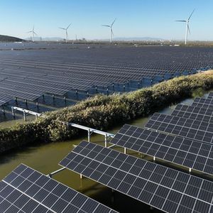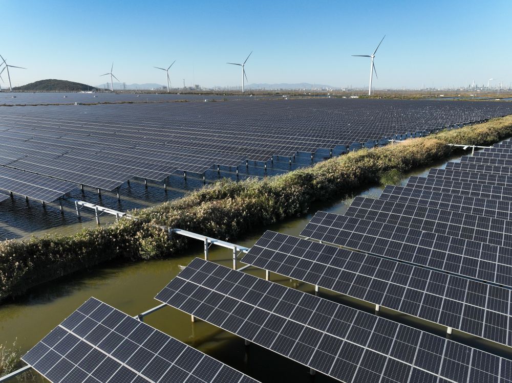 這是位于江蘇連云港市灌云縣圩豐鎮洋橋村的漁光互補發電項目(無人機照片,2023年11月17日攝)。新華社記者 季春鵬 攝