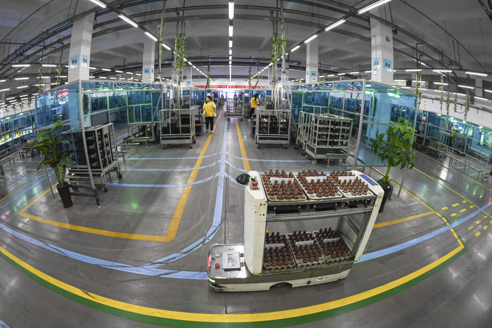 在江蘇蘇州一家企業生產車間,AGV小車在搬運物資(2020年9月18日攝)。新華社記者 季春鵬 攝