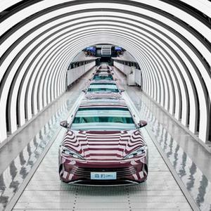 在比亞迪工廠焊接車間,記者看到,數十臺機器人手臂組成一個焊接流水線。一架架已焊接成型的車身被自動傳送至涂裝車間,在完成涂裝后又被傳送至總裝車間。S形的拼裝線上,一輛輛新款汽車被組裝完成并下線。