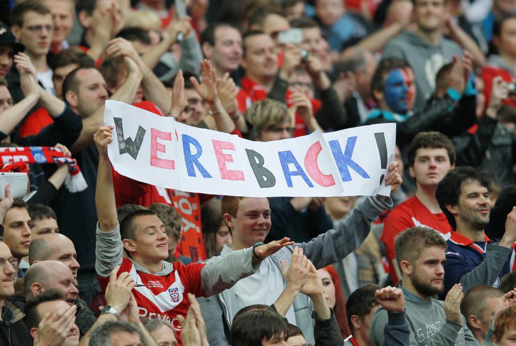 2012年5月20日,在溫布利球場舉行的2011-2012賽季英格蘭足球全國聯賽附加賽決賽的比賽中,約克城隊2:1力克盧頓城隊,奪得冠軍。圖為約克城隊球迷慶祝勝利。新華社發