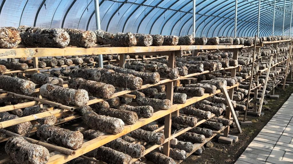 卡子村的菌菇大棚里,一根根菌棒整齊排列。新華社記者任瑋 攝