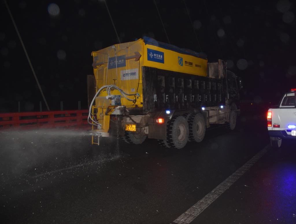 12月18日晚,筑大高速黔西段的“一路三方”有關作業隊正在對鴨池河大橋路面進行融雪除冰工作。新華社記者李凡 攝