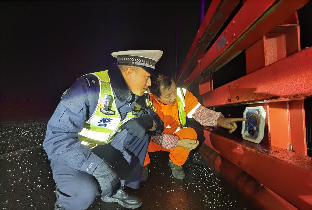 來到橋中間,羅兵龍步行一段距離,彎腰用手摸了摸橋面,看路面是否還有凝凍,同時和大橋上安全小屋值班人員何武剛一同檢查橋面溫度、濕度等數據,不一會兒,他們冷得直打哆嗦。在其余路段,他走上前去,反復檢查路面是否濕滑。所有的易凝凍路段,羅兵龍都認真檢查。
