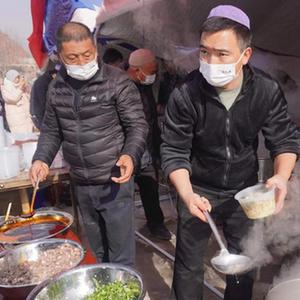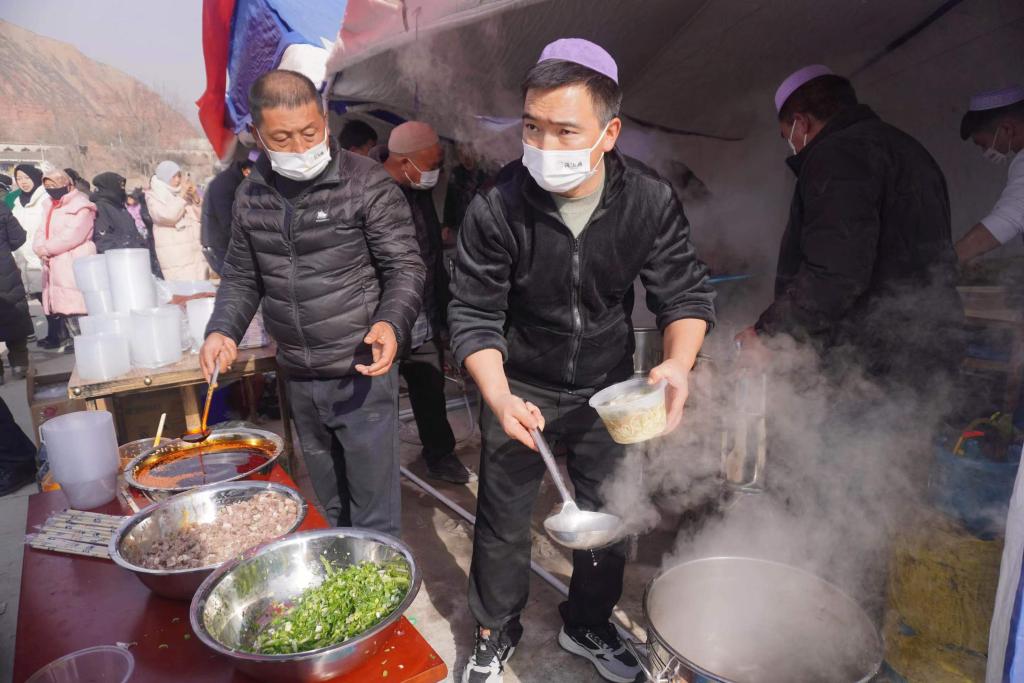 12月19日,在甘肅臨夏積石山縣大河家鎮大河村安置點,蘭州餐飲企業“筷上癮”為受災群眾送來愛心牛肉面。新華社記者 馬希平 攝
