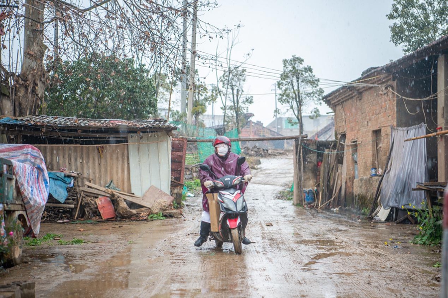 “摩托村醫”丁玉強騎車到村民家中進行健康檢查。新華社記者 伍志尊 攝