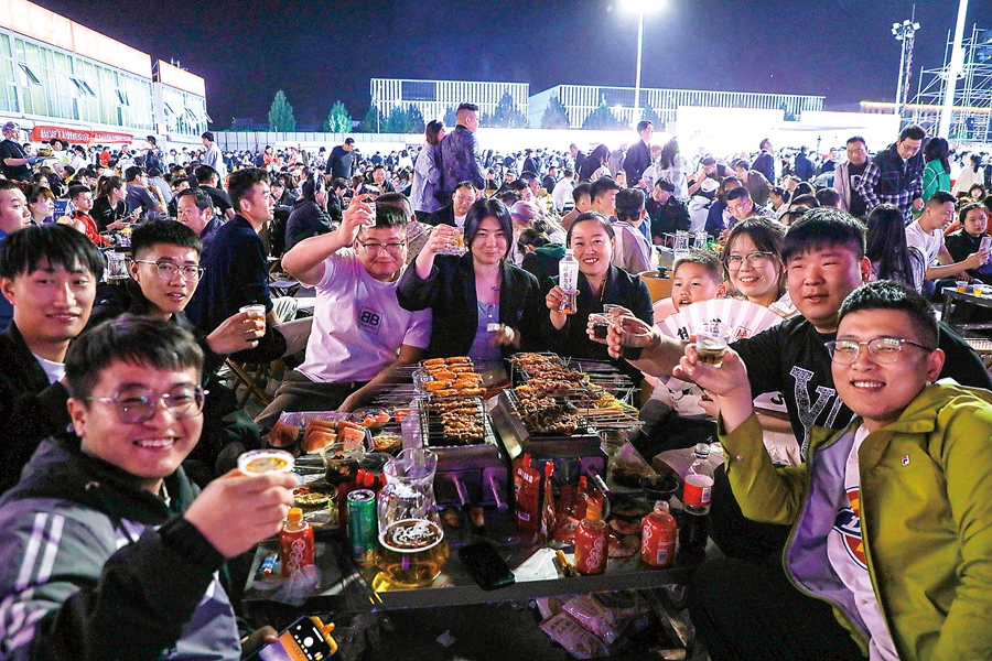 游客在淄博市一家燒烤城吃燒烤。新華社發(朱偉攝)
