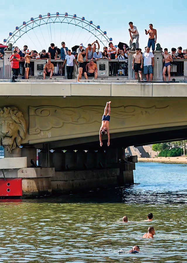 8月29日,在天津海河上,一位“大爺”從獅子林橋跳入水中。新華每日電訊記者 孫凡越 攝