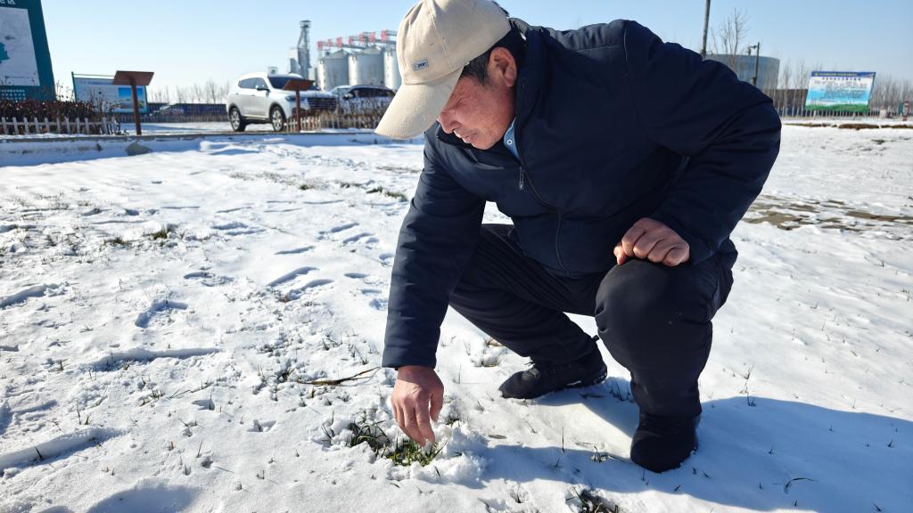 山東齊河縣種糧農民李建國正在查看冬小麥苗情。新華社記者 蕭海川 攝