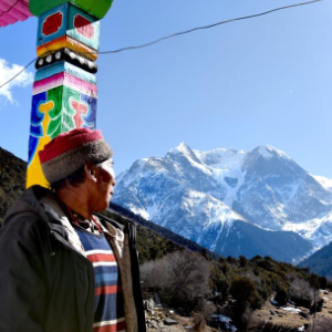 達瓦江村在自己的民宿二樓眺望梅里雪山群峰(1月5日攝)。新華社記者劉文博 攝