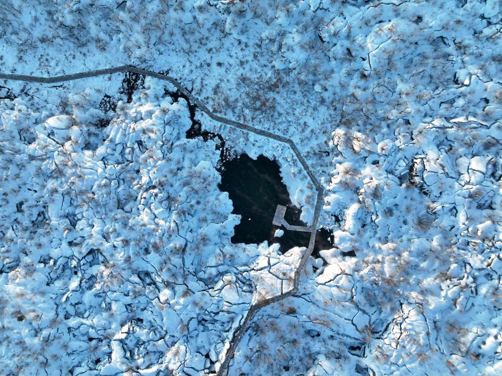“五大連池另一個神奇的景觀就是‘溫泊仙境’。溫泊有大大小小26個自涌泉,全長1800多米,那里的水溫常年保持在14攝氏度左右,即使在戶外溫度零下40攝氏度以下仍然不凍,熱氣騰騰?!痹诹_曼的帶領下,穿過蜿蜒的棧道和被白雪覆蓋的翻花石海,一處盆景式火山奇觀便呈現在眼前。