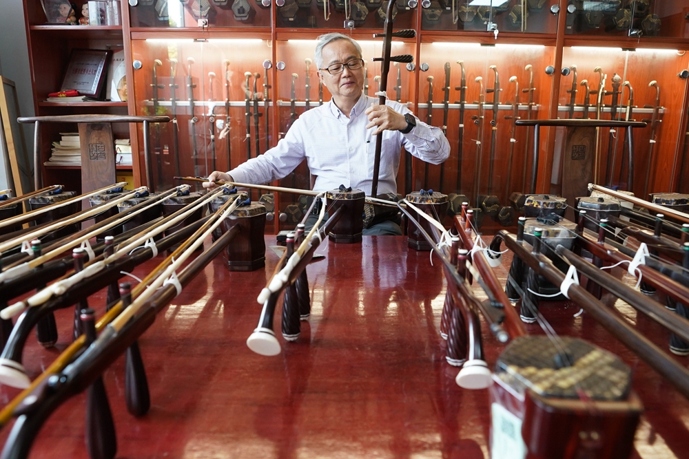 香港樂器經銷商在無錫梅村街道二胡產業園古月琴坊車間內試琴(2023年3月28日攝)。本報記者季春鵬攝
