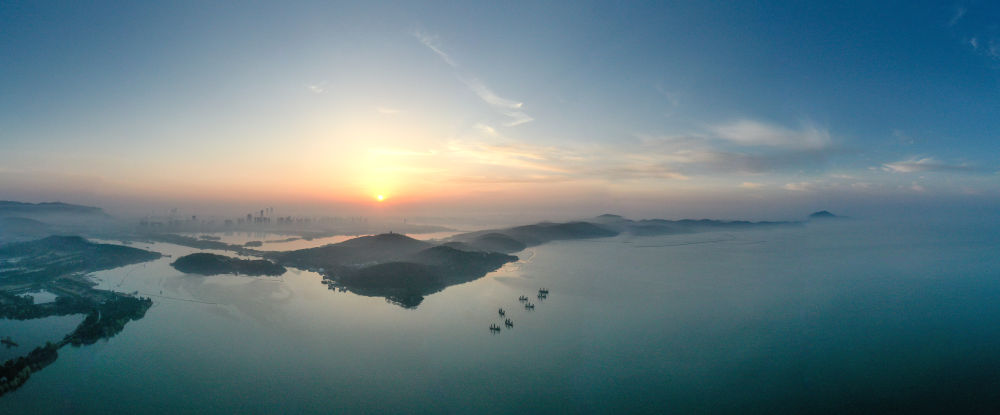 初升的太陽照耀在太湖之濱的黿頭渚景區(無人機全景照片)。本報記者楊磊攝