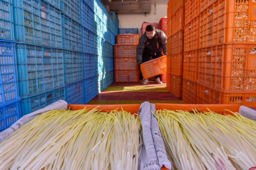 1月23日,西留村鎮朱山莊村的農戶將蒜黃裝車外運。(受訪單位供圖)