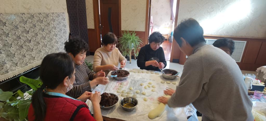村南頭的張愛琴家,七八個婆姨們聚在一起,和面的和面,蒸面的蒸面,包糕的包糕,手上不停,嘴上也不停,樂呵呵拉著家常,沒一會兒就包了滿滿一桌的糕。
