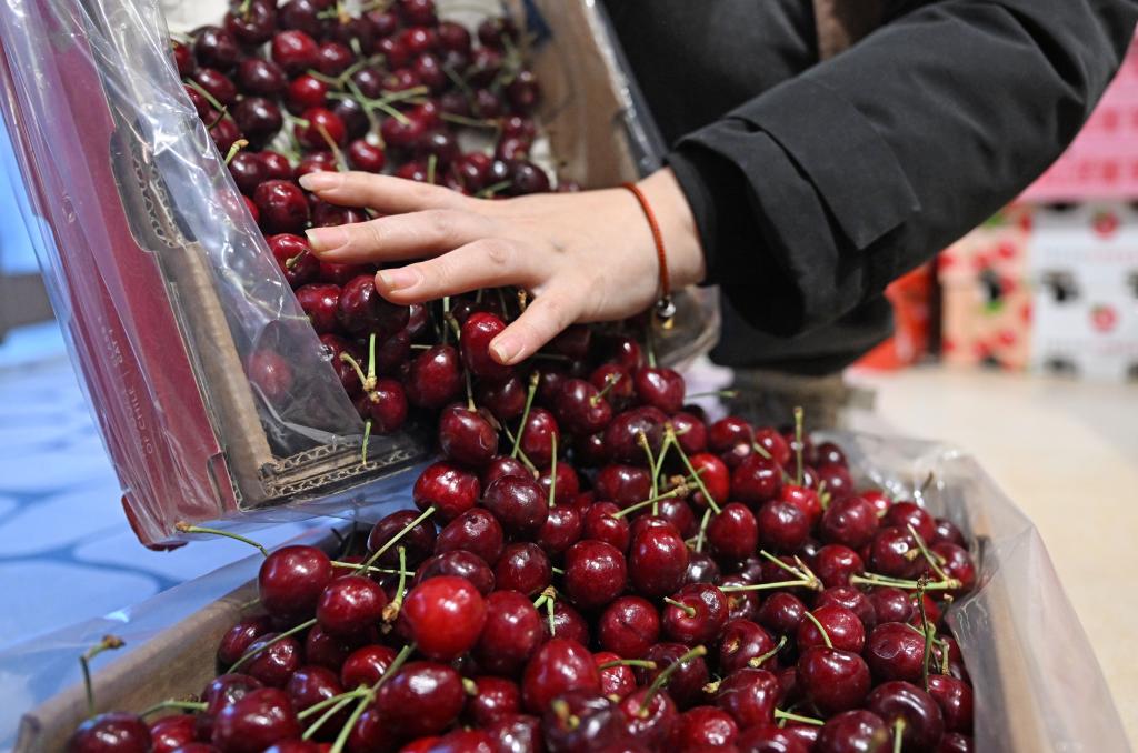 1月20日,在天津市南開區一家水果店內,店員在給智利車厘子貨架補貨。新華社記者趙子碩 攝