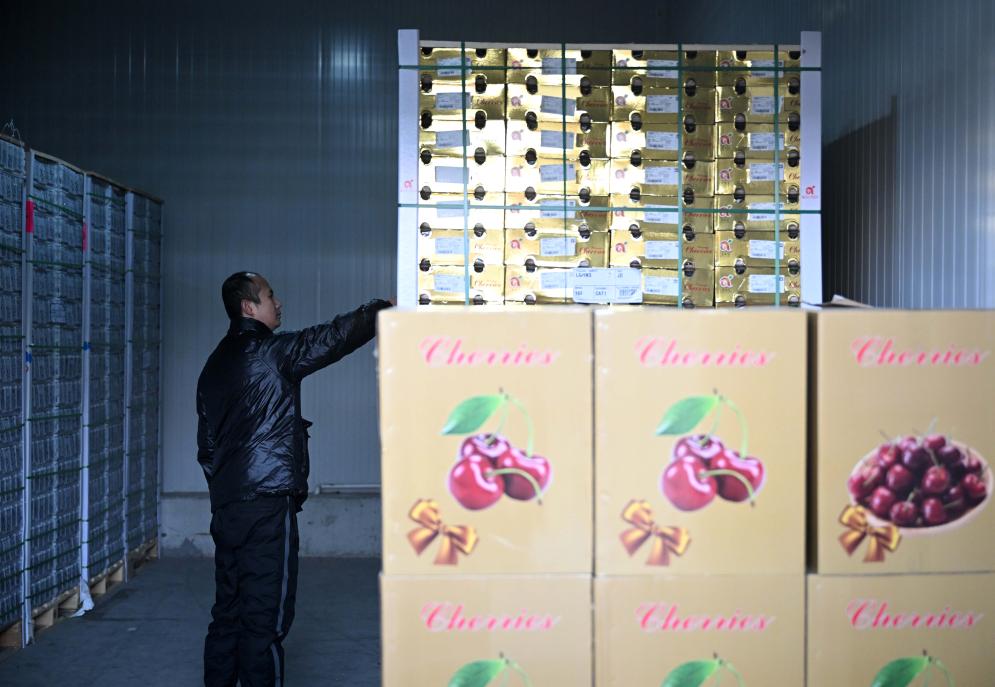1月17日,在天津東疆保稅港區,東疆海關工作人員正在查驗進口車厘子。新華社記者趙子碩攝