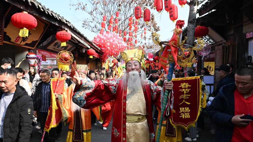 龍年大年初一,閬中古城張燈結彩,人流如潮。觀賞舞龍舞獅表演,讓春節老人賜個福,看“張飛巡城”……來自五湖四海的游客匯聚于此,在“中國春節文化之鄉”——四川閬中感受年味十足的節日氛圍。