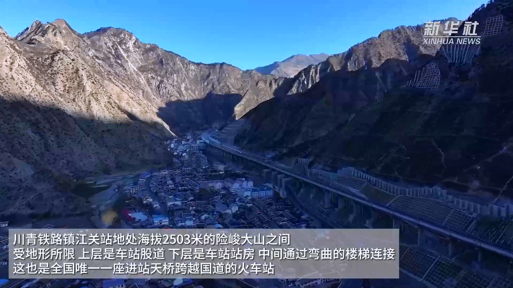 川青鐵路鎮江關站地處海拔2503米的險峻大山之間。受地形所限,上層是車站股道,下層是車站站房,中間通過彎曲的樓梯連接。這也是全國唯一一座進站天橋跨越國道的火車站。