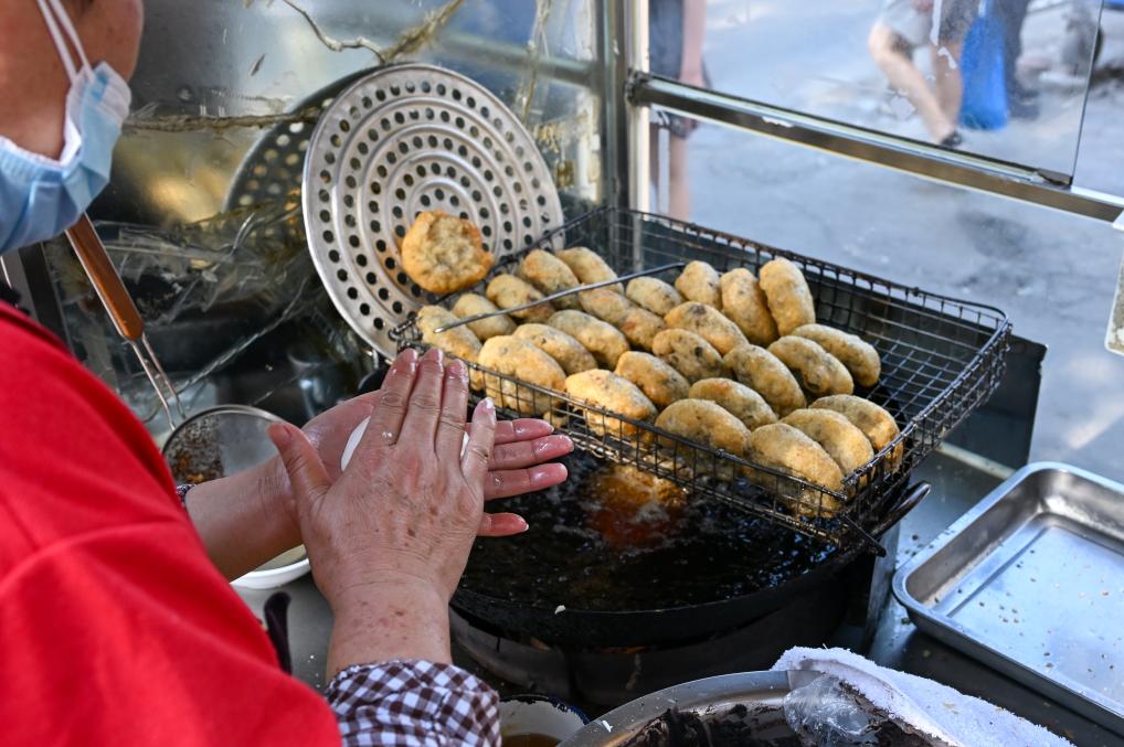 2023年7月10日,在天津市紅橋區西關大街一家早點鋪,商家在制作炸糕。新華社記者 孫凡越 攝