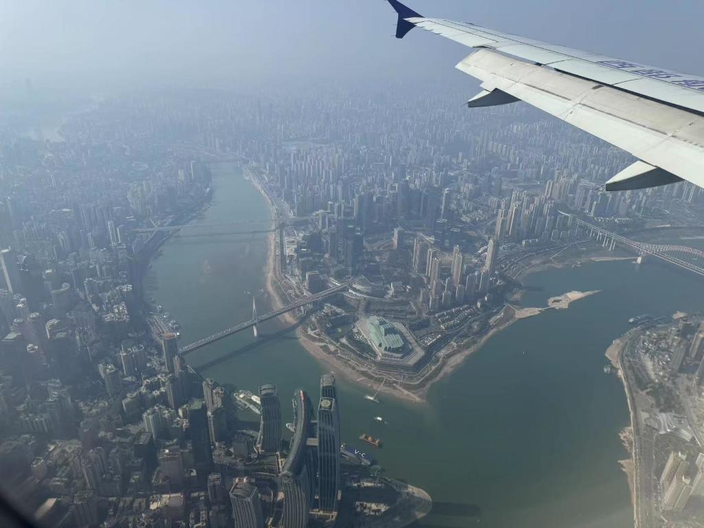 返程飛機環繞重慶渝中半島,從高空望下,樓房錯落有致,大橋飛跨兩岸,嘉陵江與長江在此相遇。日日是春日、日日是好日,春意融融的陽光正訴說著開年的熱乎勁兒。