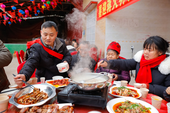 2月2日,蔣光德(前左二)、李秀華(前右二)夫婦、女兒蔣見香(前右一)和兒子劉永旺(原名蔣火林)(前左一)在家中吃壩壩宴慶祝一家人團聚,劉永旺給母親夾菜。組圖均由新華社記者 沈伯韓 攝