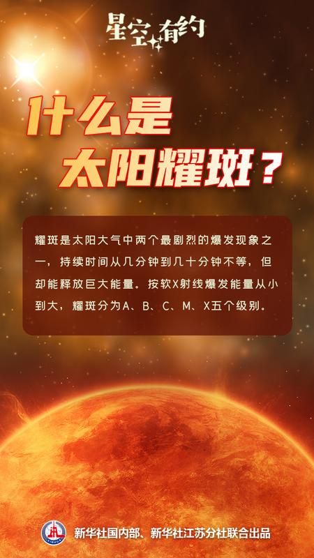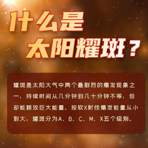 “耀斑是太陽大氣中兩個最劇烈的爆發現象之一,源自太陽局部磁場作用短時間內快速釋放出大量能量,包括產生全波段輻射增強、物質運動、粒子加速等?!碧饺招l星“夸父一號”首席科學家、中國科學院紫金山天文臺研究員甘為群介紹,耀斑持續時間從幾分鐘到幾十分鐘不等。特大耀斑釋放的能量甚至可以和太陽每秒鐘釋放的總能量相比擬。按軟X射線爆發能量從小到大,耀斑分為A、B、C、M、X五個級別,每個級別間能量相差十倍,比如X1.0級耀斑比C1.0級耀斑強100倍。