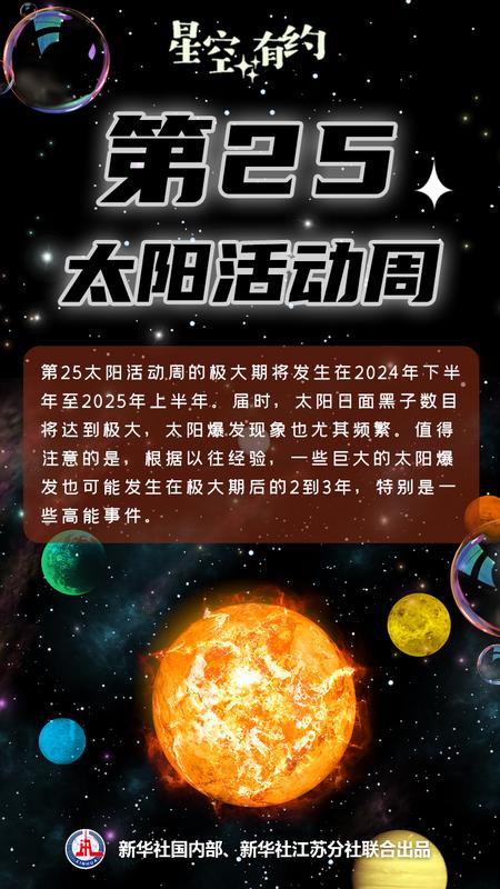 “太陽目前正處于第25個活動周期,極大期將發生在2024年下半年至2025年上半年?!备蕿槿罕硎?,這里所說的極大,是指屆時太陽日面黑子數目將達到極大。黑子區反映的是太陽上強磁場區域,磁場的演化和相互作用導致太陽上爆發事件頻發,磁能被轉化成加速的高能粒子、增強的全波段輻射、高速運動的等離子體,從太陽上釋放出來。其中,最具代表性的現象就是太陽耀斑和日冕物質拋射這兩類太陽上最劇烈的爆發現象。