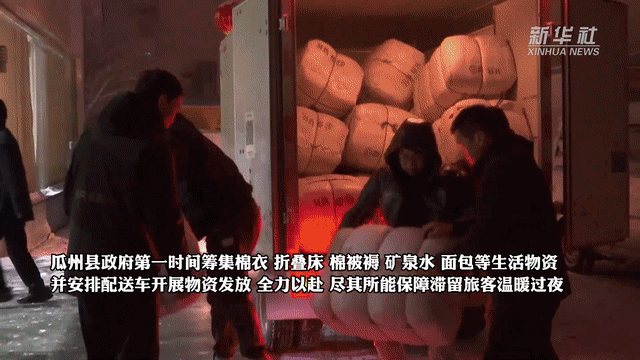 瓜州縣公安、消防、交通、應急、街道等各部門和單位迅速行動。1000多件棉衣,以及4000多人份的泡面、大餅、礦泉水等物資迅速調撥到位,分發到滯留人員手里。