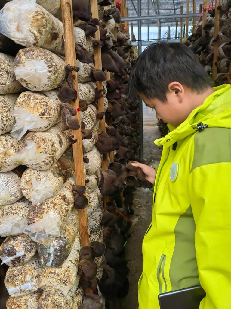 2月13日,在廣西融水苗族自治縣四榮鄉移民安置點,學生利用假期到木耳種植基地體驗采收木耳。(何海云 攝)