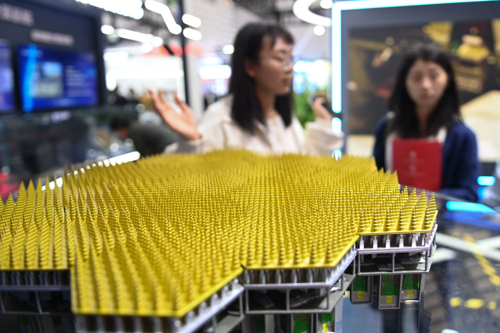 觀眾在2023年世界互聯網大會“互聯網之光”博覽會的之江實驗室展臺了解射頻相場望遠鏡核心單元(2023年11月7日攝)。新華社記者 黃宗治 攝