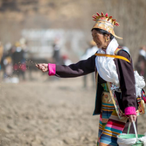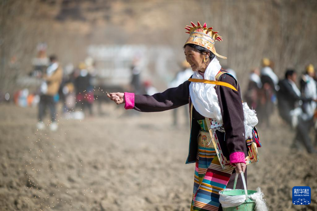3月16日,在西藏山南市瓊結縣加麻鄉加麻村的春耕儀式現場,農民播撒種子。新華社記者 旦增尼瑪曲珠 攝