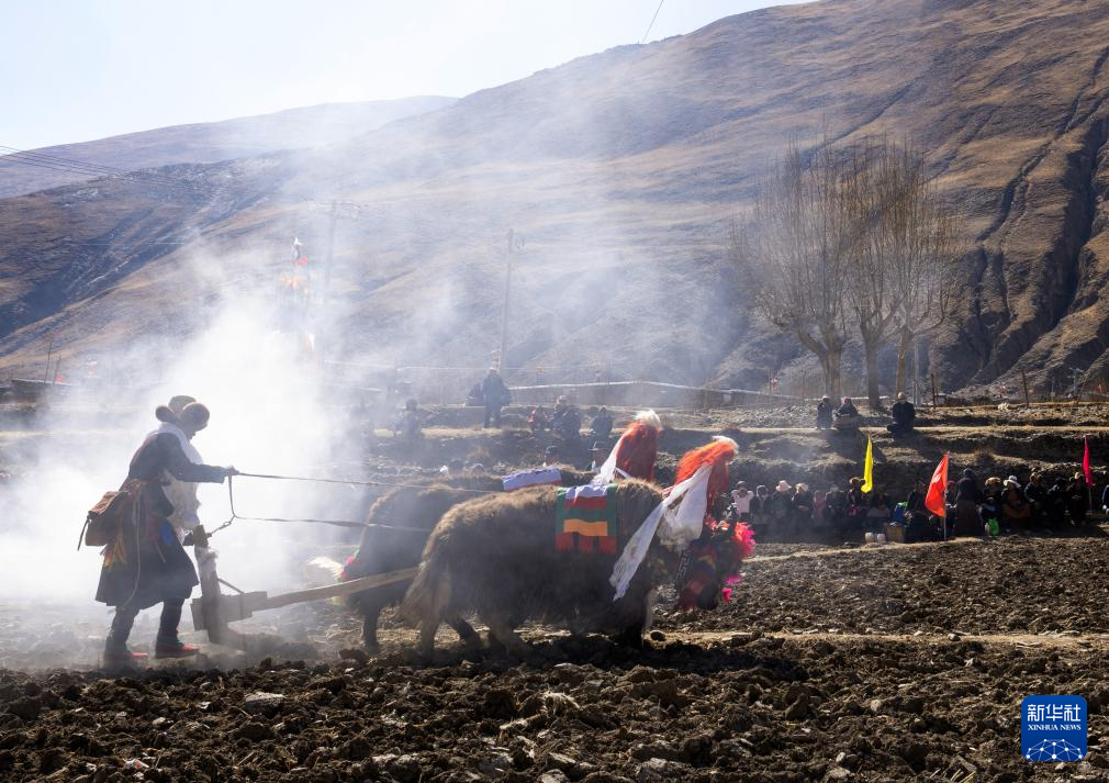 離村莊不遠的一處農田上,在百余名村民的注視下,12名壯年男子哼唱著古老的曲調,驅趕耕牛耕出新年的第一犁?!稗r業生產早就實現了機械化,之所以用傳統的‘二牛抬杠’來舉行開耕儀式,是為了更好地傳承高原農耕文化?!奔勇榇逦瘑T會主任土旦說。