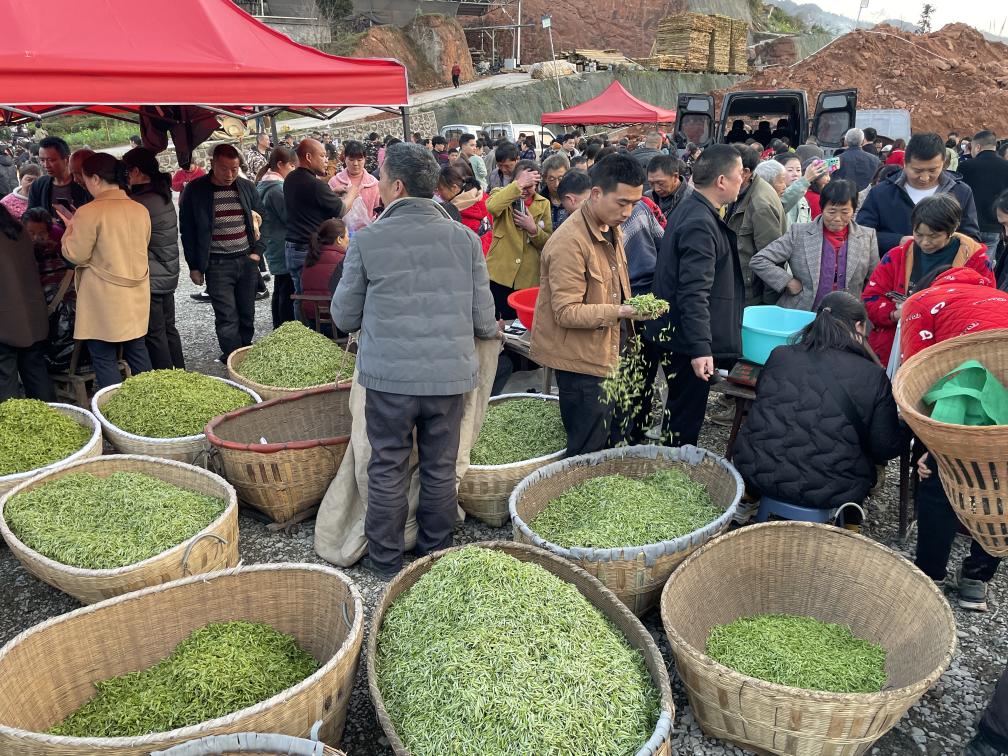 3月19日,位于芭蕉鄉集鎮的茶葉鮮葉臨時交易市場一片忙碌。(黎袁媛 攝)