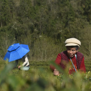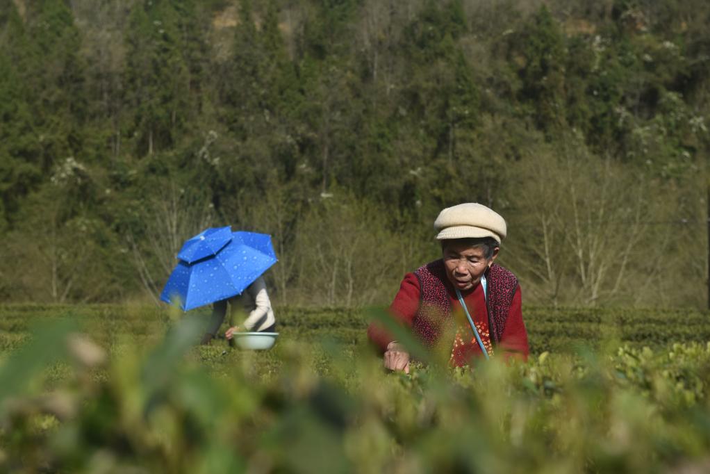 3月19日,恩施市芭蕉侗族鄉米田村茶農在茶園采摘茶葉。(黎袁媛 攝)
