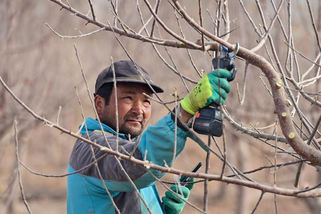 在新疆阿克蘇市紅旗坡,果農尹仕國在為蘋果樹修枝(3月23日攝)。新華社記者丁磊 攝