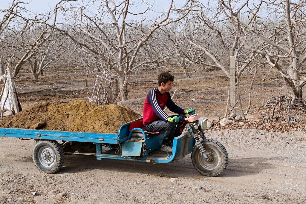 在新疆阿克蘇市紅旗坡,果農拉運羊糞給果樹追施底肥(3月23日攝)。新華社記者丁磊 攝