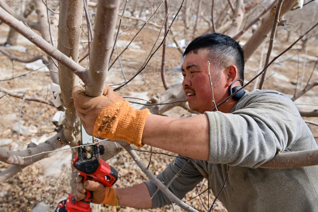 距離王超果園不遠處,果農尹仕國正忙著修枝?!拔倚捱^枝的果樹采光更好,便于管理,也延長了采摘期?!币藝畔落徸?,抖了抖身上修枝掉落的鋸末,講述著他的種植新方法。