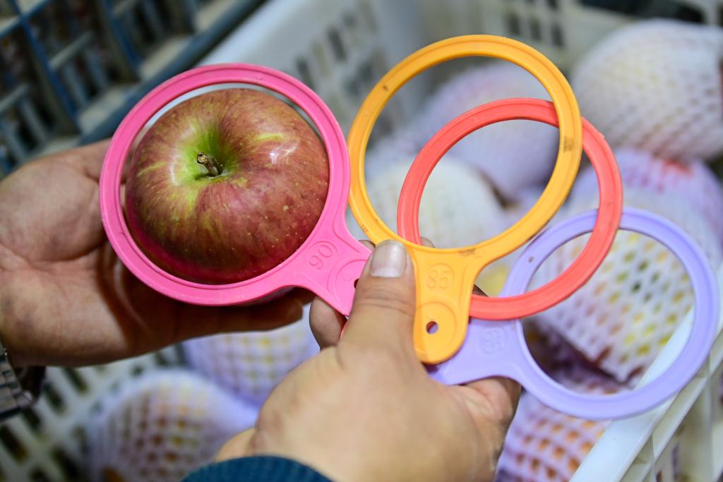 在新疆阿克蘇市紅旗坡,阿克蘇贛新果業農民專業合作社的工作人員用水果分級板測量當地種植的蘋果(3月23日攝)。新華社記者丁磊 攝