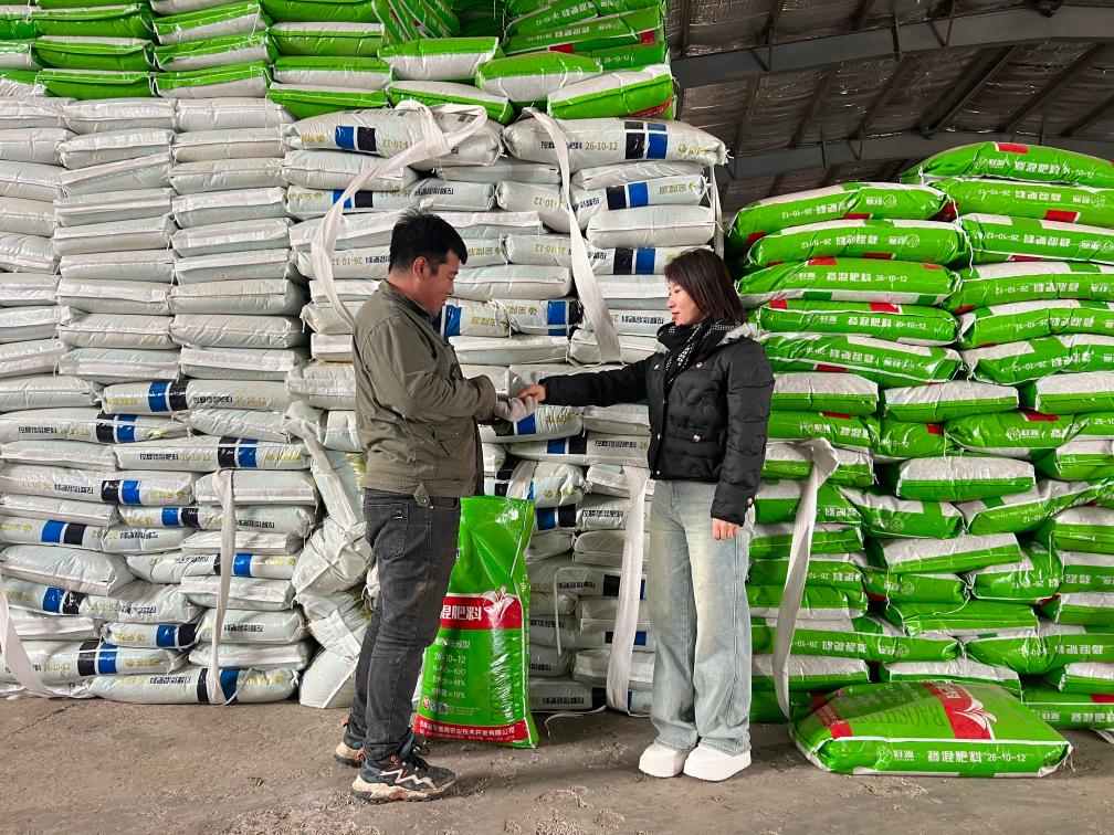 韓鳳香在跟工作人員溝通化肥相關事宜。新華社記者 司曉帥 攝