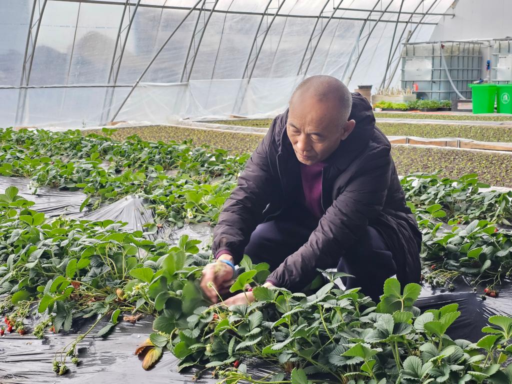 九三村村民李義承包的草莓溫室大棚內,秧苗上的草莓嬌艷欲滴。剛剛送走一批采摘的客人,他正查看土壤濕度,決定是否打開滴灌系統?!芭锸胰臻g不能高于30攝氏度,夜間不能低于8攝氏度,還要注意不能缺水?!?/p>