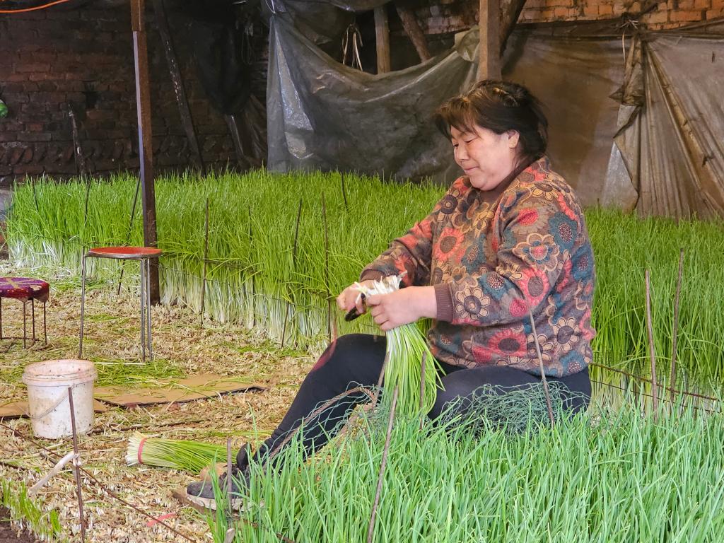 3月28日,九三村村民孫亞梅正在修剪蒜苗。新華社記者 孫曉宇 攝