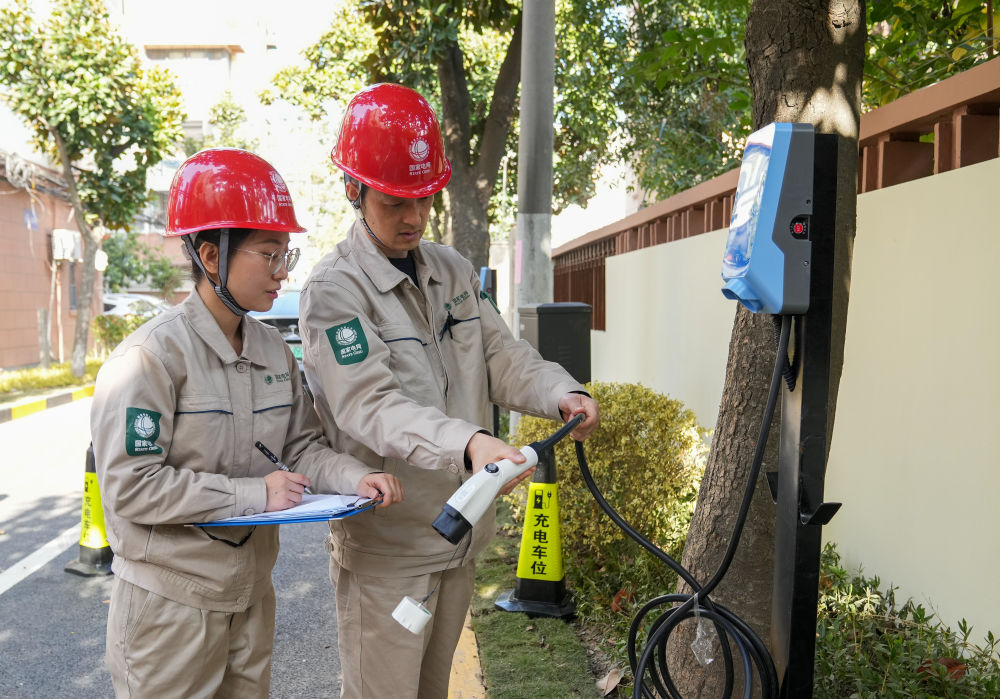 2023年11月29日,在上海市徐匯區田林十三村小區內,國網上海市南供電公司的工作人員在檢查充電樁運行情況。新華社記者 丁汀 攝