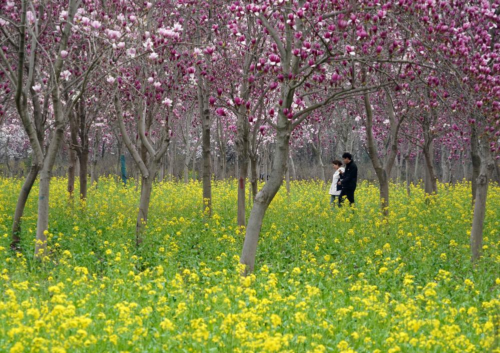 游客在位于河南省鄢陵縣的一處園林內賞花游玩(3月26日攝)。