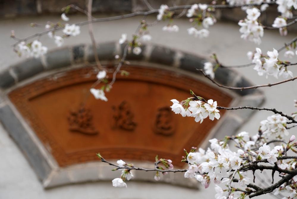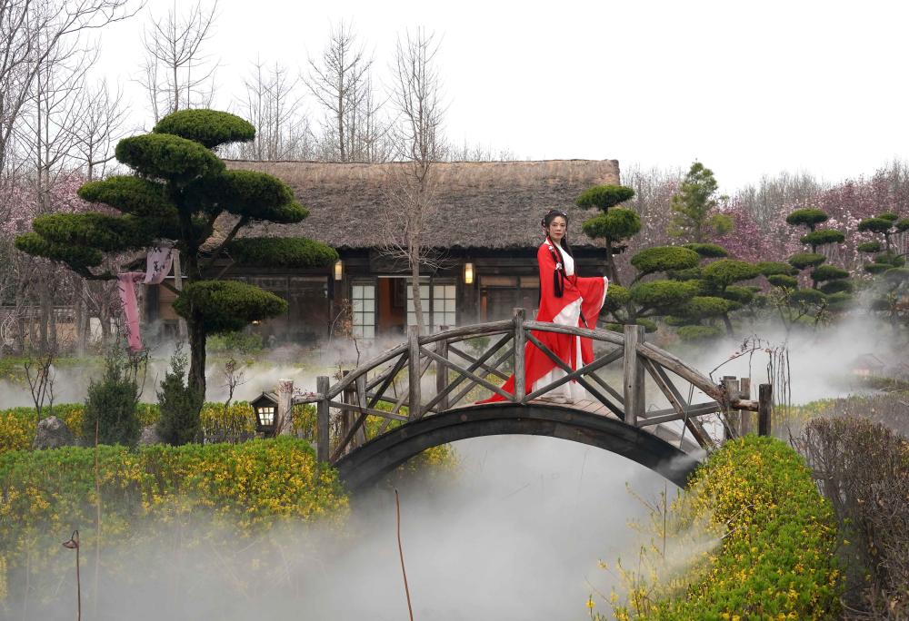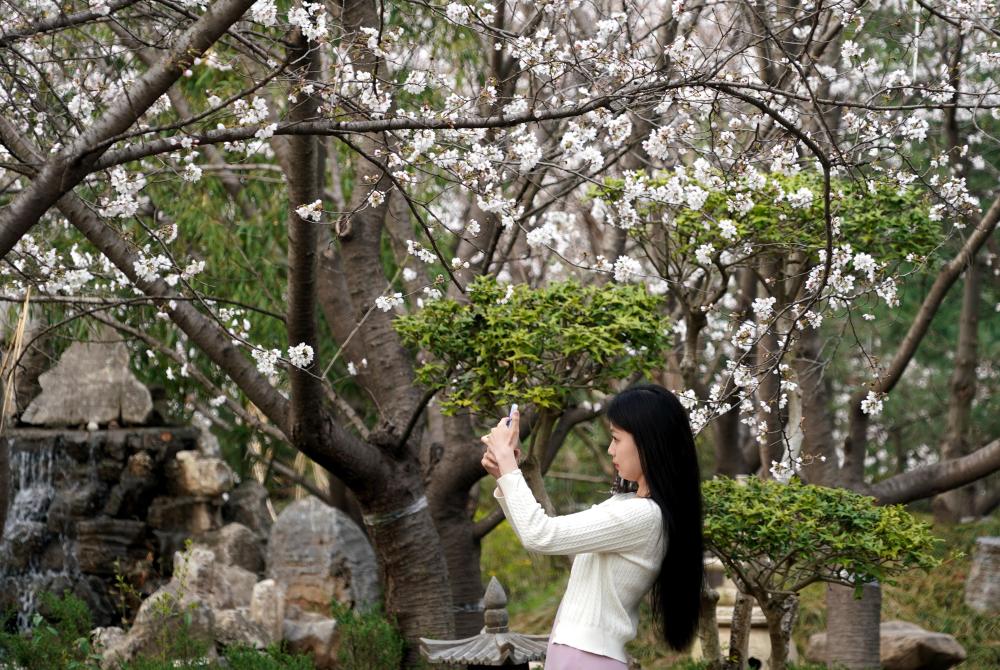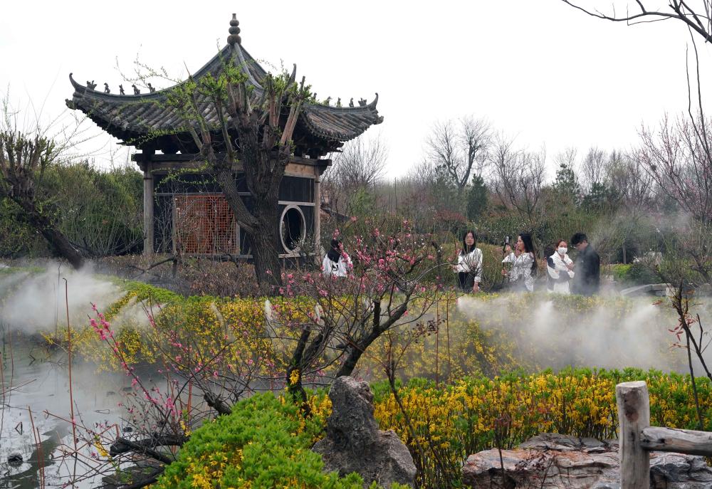 游客在位于河南省鄢陵縣的一處園林內賞景拍照(3月26日攝)。
