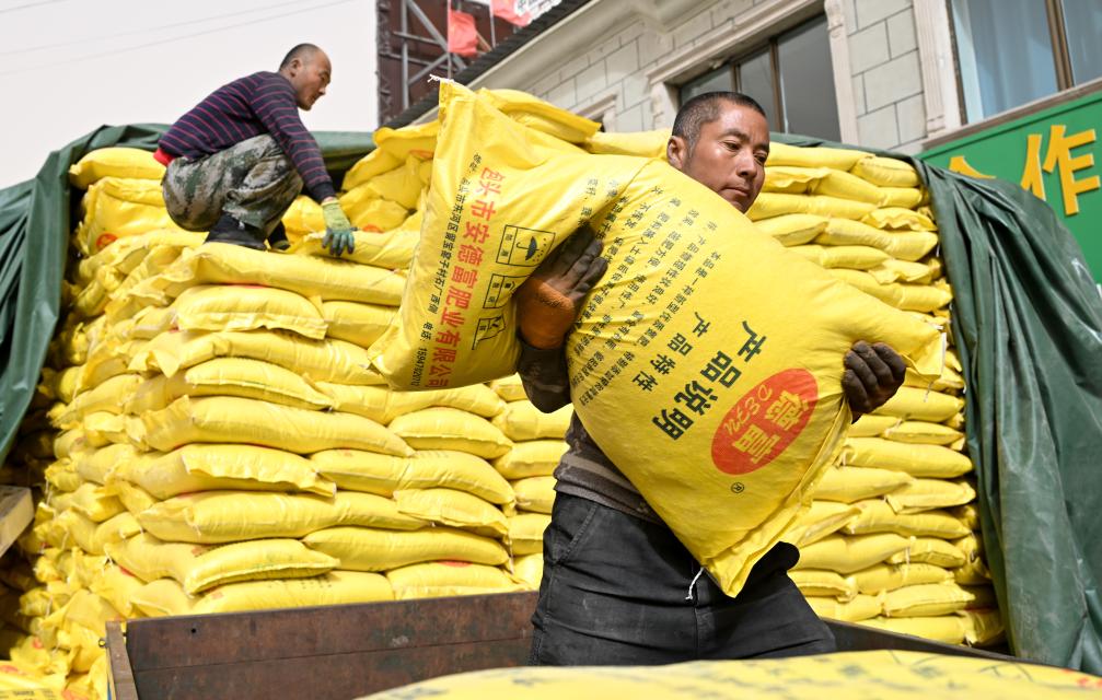 3月27日,工人在內蒙古呼和浩特市土默特左旗敕勒川鎮只幾梁村年年有余農業發展有限公司搬運化肥。新華社記者 貝赫 攝